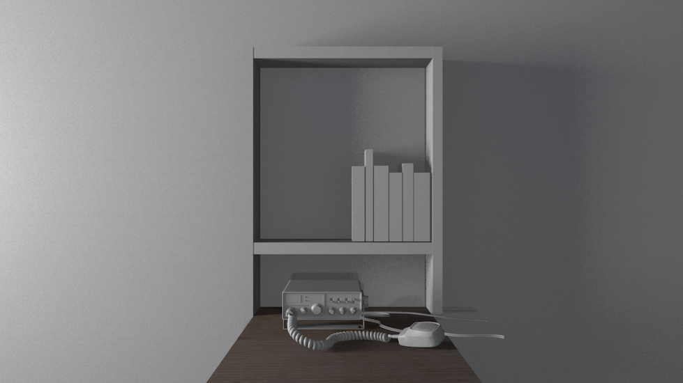 Con el tema del render último que pusiste, el entorno le quita mucho realismo a la emisora, no sabría decirte exactamente porque, quizá la iluminación general, quizá la falta de detalles en los libros (al ser tomas tan cerca, creo que deberías detallar más los pocos objetos que entran en escena), el bump o relieve de la pared, tiene mucha presencia (según mi parecer).