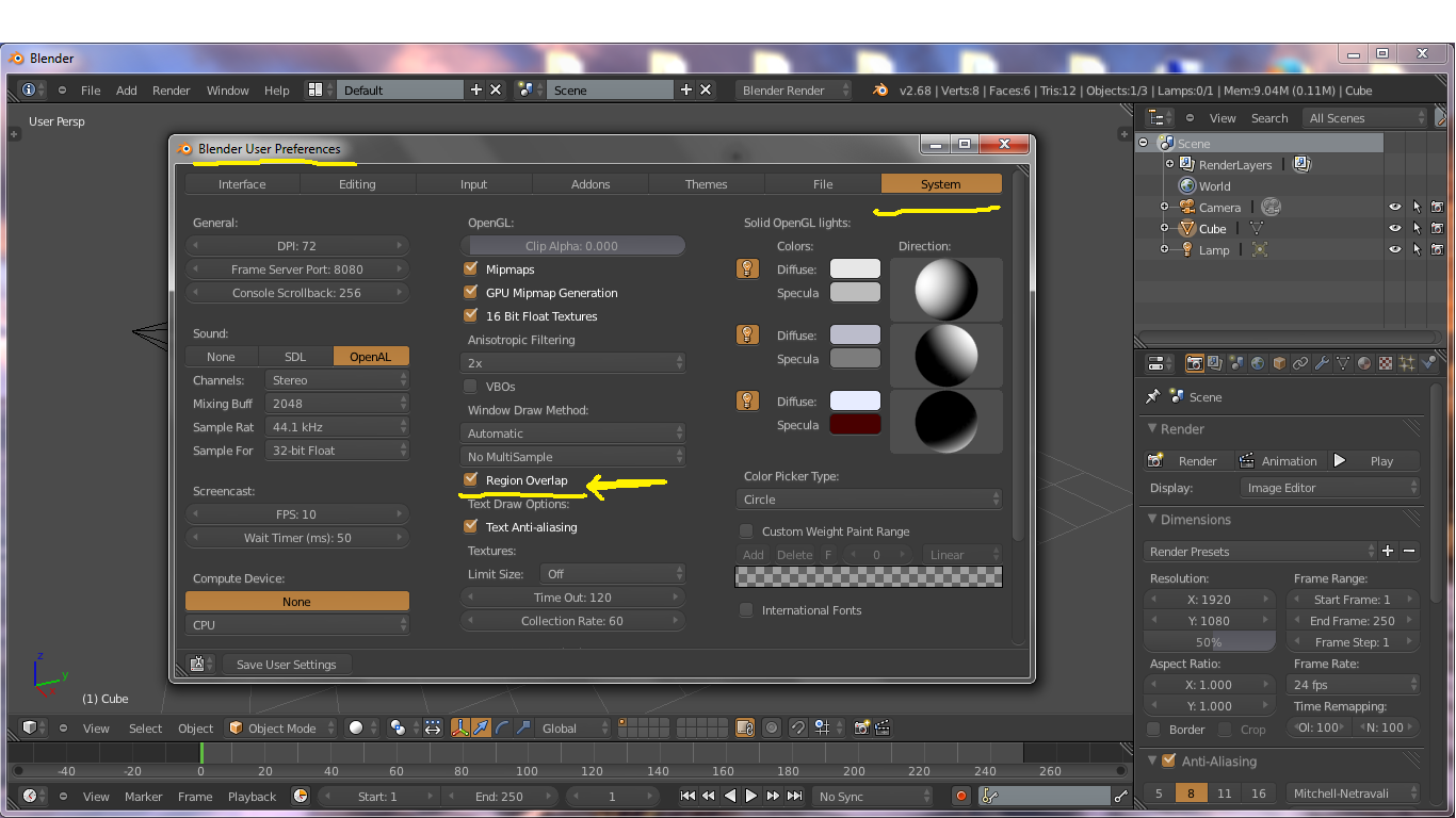 Abre una ventana de User Preferencias, y en SYSTEM activas la casilla REGION OVERLAP