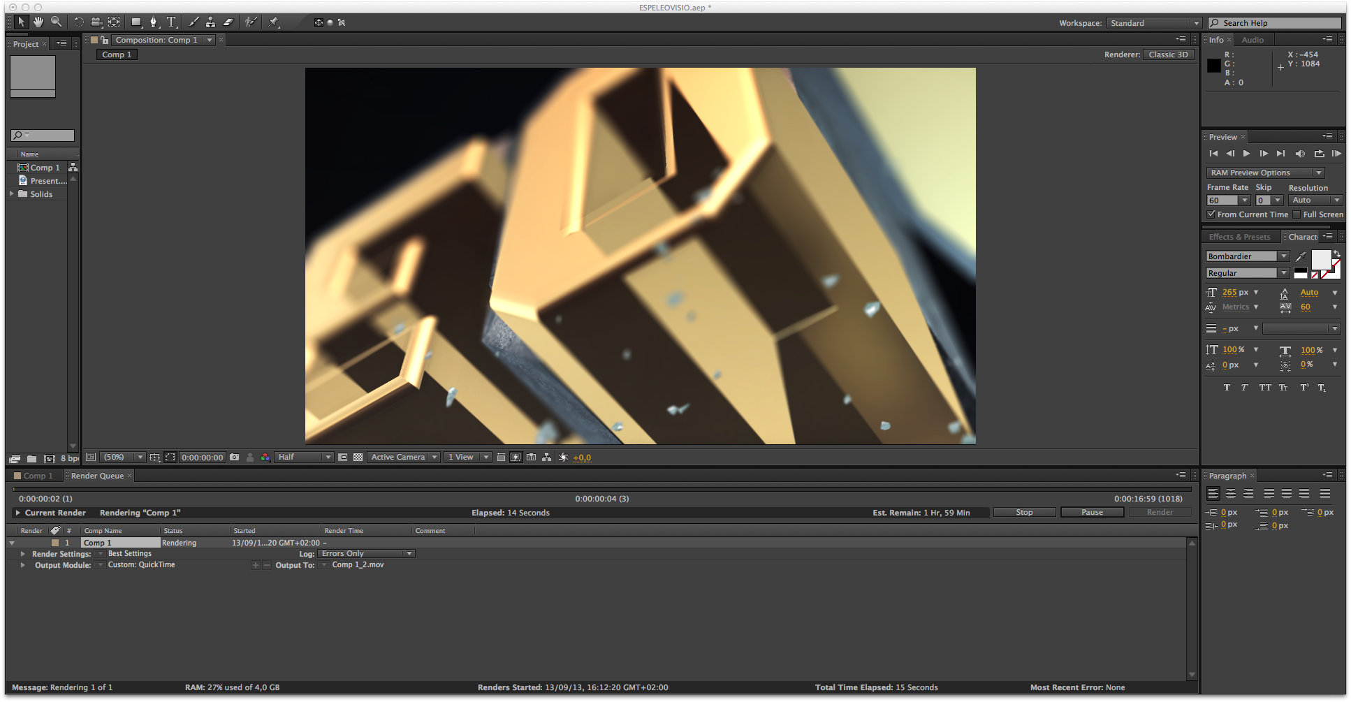 Hola. Estoy haciendo una introducción con el plug-in Element 3D de After Effects. En teoría el video debería quedar así: