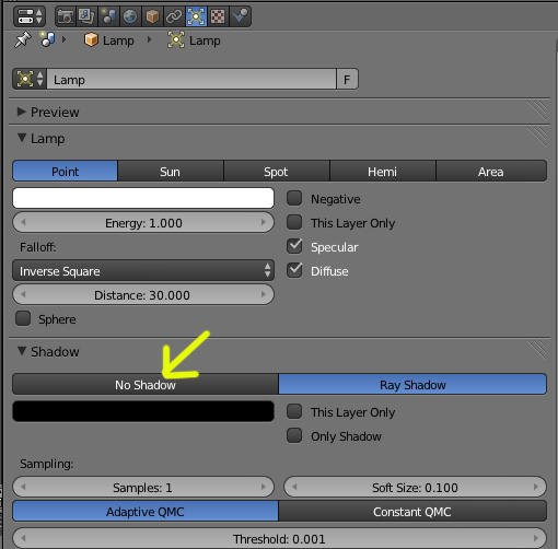 1º Las sombras en Blender se pueden activar/desactivar seleccionando la lámpara y en Shadow eliges la opción No Shadow.