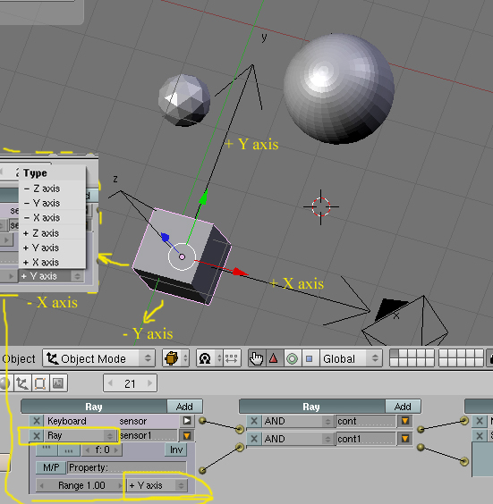En la imagen se ve que tiene puesto el eje + Y axis. Eso quiere decir que cuando pase junto a un objeto que esté a su derecha y a una distancia de un cuadrado, se producirá la opción que pongamos en el Actuators.