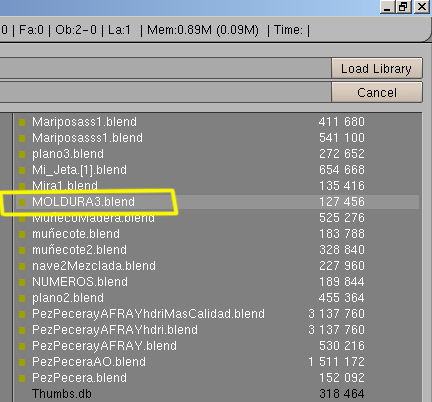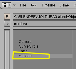 En mi caso se llama MOLDURA. Luego hemos de buscar lo que queremos cargar. Solo decir, que se pueden cargar tanto como Objetos, como Materiales, Worlds, etc.