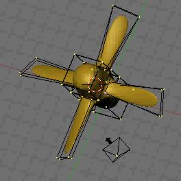 Pasamos a la vista superior 7 seleccionamos todos los vértices A. Copiamos y rotamos 90 grados Shift+D y luego R (recuerda poner el cursor y seleccionarlo como eje de rotación). Quedará como la imagen. Repetimos lo mismo para las otras dos palas.