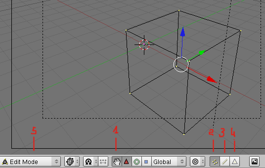Todo esto se consigue estando en la opción Edit Mode (en el dibujo primero el Nº: 5) o sea Modo de edición. Si lo cambiamos a Object Mode (Modo Objeto) lo que hacemos es mover el objeto entero no sus vértices.
