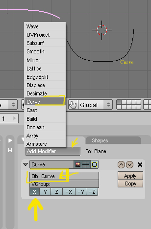 Ahora selecciona el plano y en Modifiers selecciona Curve. Para qué el objeto se acople a la curva debemos escribir el nombre de la curva en OB: