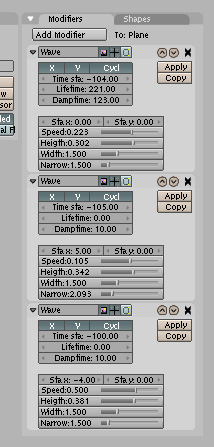 Se pueden poner varios modificadores Wave en el mismo plane, para ello solo tienes que volver a presionar Add Modifier, para crear otro efecto que se sumara al que ya tenías; un ejemplo sería esta marea fuerte con tres modificadores.