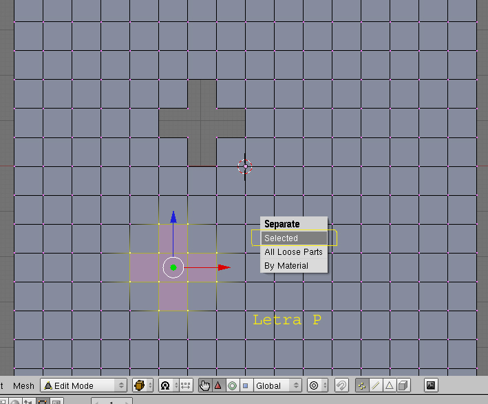 Seleccionamos los vértices, presionamos la letra P y la opción Selected. Eso hará que ese grupo de vértices se convierta en un objeto nuevo y separado del principal. Es la diferencia con el comando Split, que lo corta, pero no lo separa de la malla.