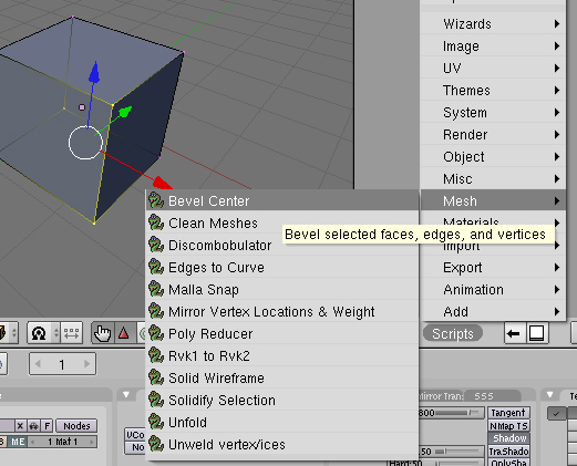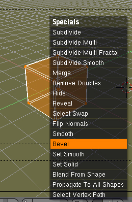 Seleccionas la cara qué quieres darle el bevel (suavizado) y haces un Mesh>Bevel>Recursive.