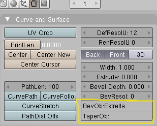 Seleccionamos la línea llamada Base presionamos F9 y en la ventana Curve and Surface en BevOb: escribimos el nombre de Estrella.