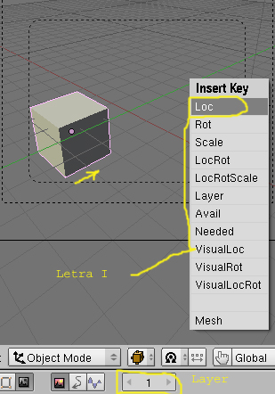 Ahora voy a crear un plugin de animación. Para ello primero que voy a hacer es animar el objeto, de una forma sencilla. Coloco el cubo en uno de los lados i con el Layer en posición 1 y estando en Object Mode, presiono la letra I y la opción Loc.