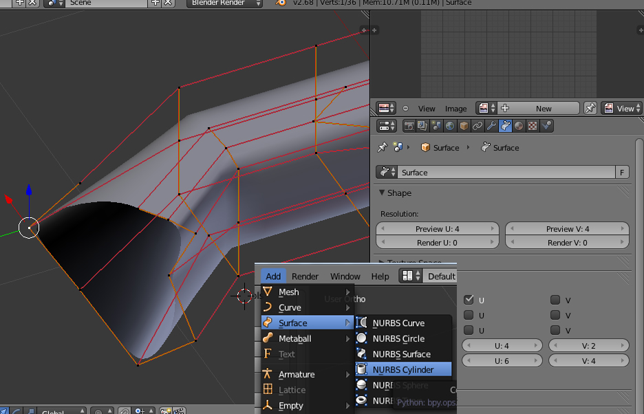 Añade un objeto a la escena de tipo NURBS desde. Add > Surface > NURBS > Cilinder.