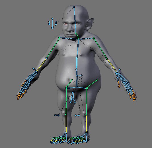 Entonces, manipulé un personaje parecido a un enano en que estaba trabajando, que se basaba en una malla humana y que tenía hacía mucho tiempo, y comencé a hacer el rigging. Las nuevas Herramientas de modelado Sculpt y MultiRes de Blender son sorprendentes.