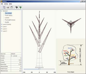 El primero a comentar es Arbaro. Arbaroes un generador de árboles fácil de usar que permite configurar varios parámetros del árbol y exportarlo como archivo PovRay, DXF o Wavefront OBJ. Lo cual le permite integrarse fácilmente con Blender.