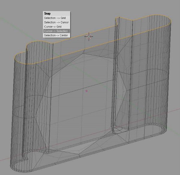 Debido a qué ya hemos construido el perfil, podemos fácilmente copiarlo y pegarlo. Sin embargo, el duplicado se desplazara al otro lado del iPod y es muy difícil hacerlo a mano. Sin embargo, otra vez el cursor 3D de Blender viene a ser muy práctico. En lugar de sólo mover la malla voy a fijar el objeto 3D. Seleccionar completamente el otro borde del iPod y ajustar el cursor 3D a esa posición. El cursor 3D se encuentra ahora en el centro de la malla de la selección. Esto es muy importante a tener en cuenta. En el siguiente paso duplicamos la tapa y reseteamos el punto central de la malla con el Nuevo Centro. Esto mueve el punto central del objeto 3D al centro de la malla 3D interior.