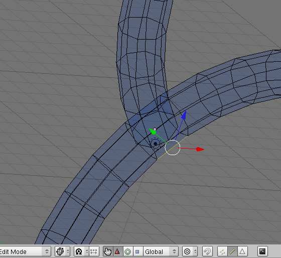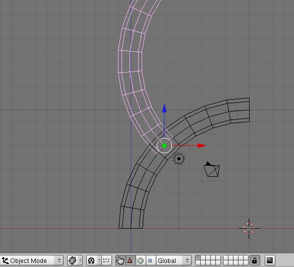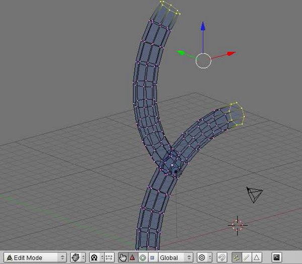 Seleccione una de las formas de tubo, dejando pulsado [Shift(mayúscula s)] entonces seleccione el otro clickeando con el derecho. Presionando [ctrl j] se unirán las formas en una malla editable. Presionando [Tab] revelara la nueva malla [Fig. 5].