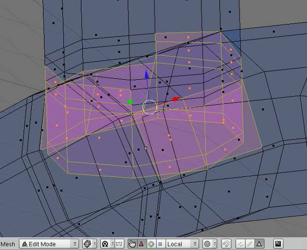 Una vez más, volver a modo de vértice y comenzar a reparar la malla seleccionando 3 o 4 vértices conectados y pulsando [f] para crear una cara [fig 14].