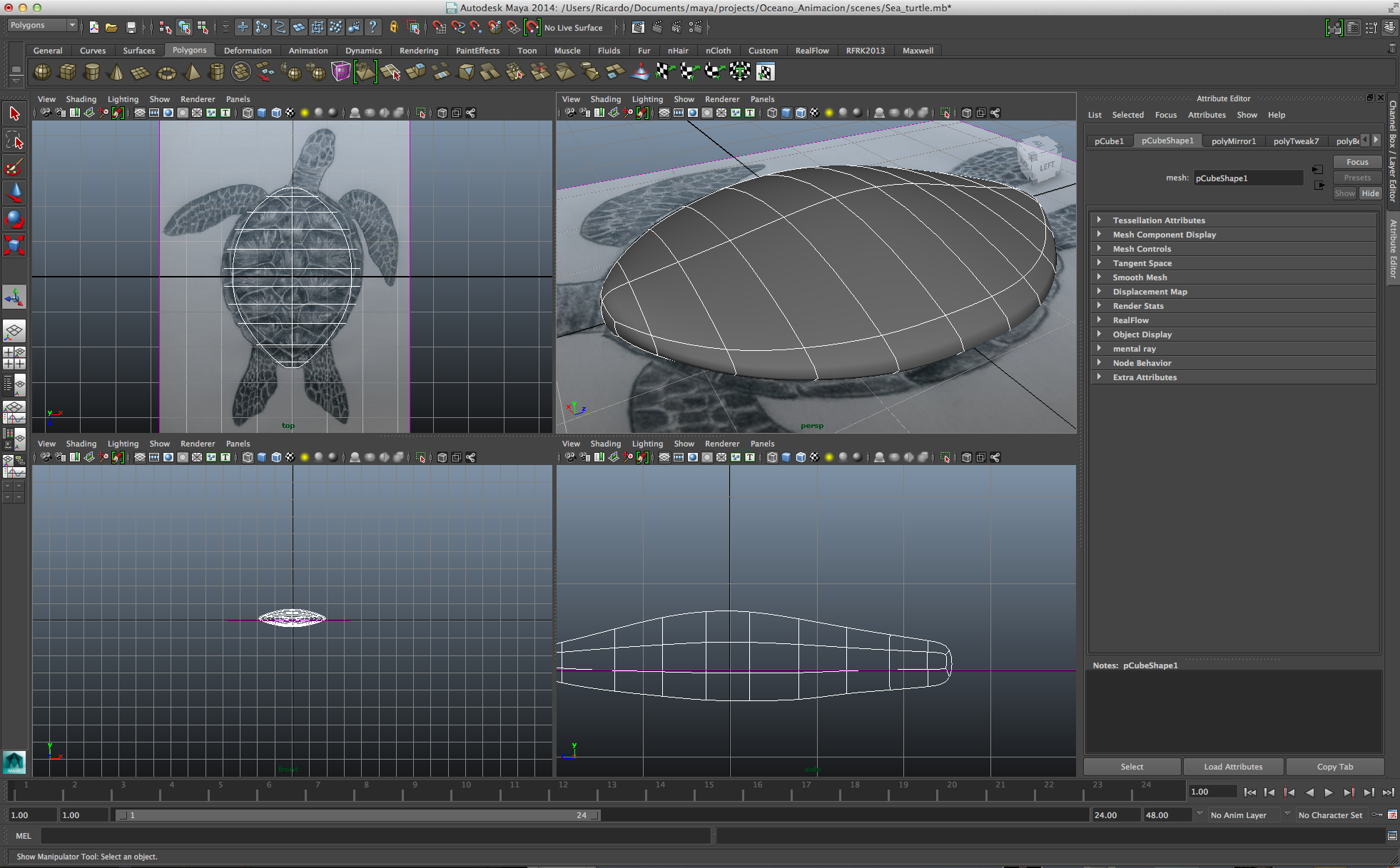 Bueno, ahora voy a hacer lo más chungo de todo el proyecto: una tortuga de mar. Con programas como ZBrush o Mudbox sería relativamente sencillo, pero no quiero hacer uso de ninguno de ellos. Tiene que ser con Maya.