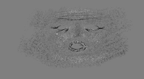 Lo siguiente fue el mapa de relieve (Bump map). Empecé con una capa gris al 50% y pinté Trazos y puntos negros para cualquier cosa que fuese hacia el interior y líneas blancas para todo lo que fuese hacia el exterior. Así es cómo he creado los poros y arrugas y la estructura básica de los labios. Unos pocos puntos blancos aquí y allá hacen que la piel no parezca tan limpia y sea más natural. Tenga en cuenta que distintas regiones de la piel tienen diferentes tamaños de poros y así sucesivamente, mírate en el espejo y averígualo.