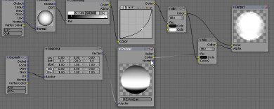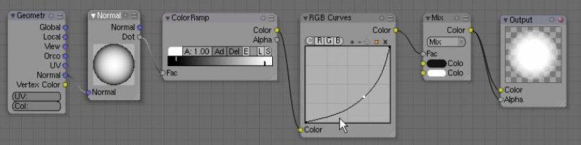 Vamos a comenzar. En primer lugar, haz un simple material y activa Ztransp, Alfa 0,0, Espec 0,0. Ahora para él Nodo, en el modo editor de nodos hay que borrarlo todo dejando sólo el de salida (no voy a explicar las propiedades de cada nodo que hay en el editor, sólo mostraré la forma de conectarlos y qué resultados da). Ahora añada a la salida, Geometría, Normal, Color de rampa, y Curvas de nodos RGB. Mézclelas y conéctelas como en la imagen de abajo.