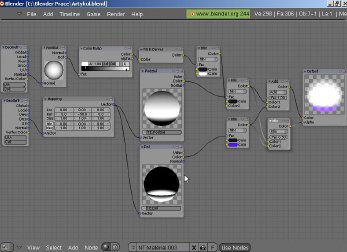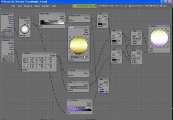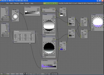 Usaremos una configuración como ésta en casi todo el tutorial, ya que nos ofrece una gran capacidad de adaptación. En este caso el objeto es cubierto con dos colores que se mezclan en la configuración de nodos, y el Mix Node se configura por ColorRamp y Normal Node. Ahora vamos a configurar un desvanecimiento del color a otro en las normales del objeto. Más tarde haremos el cambio de Normal Node a Texture Node.