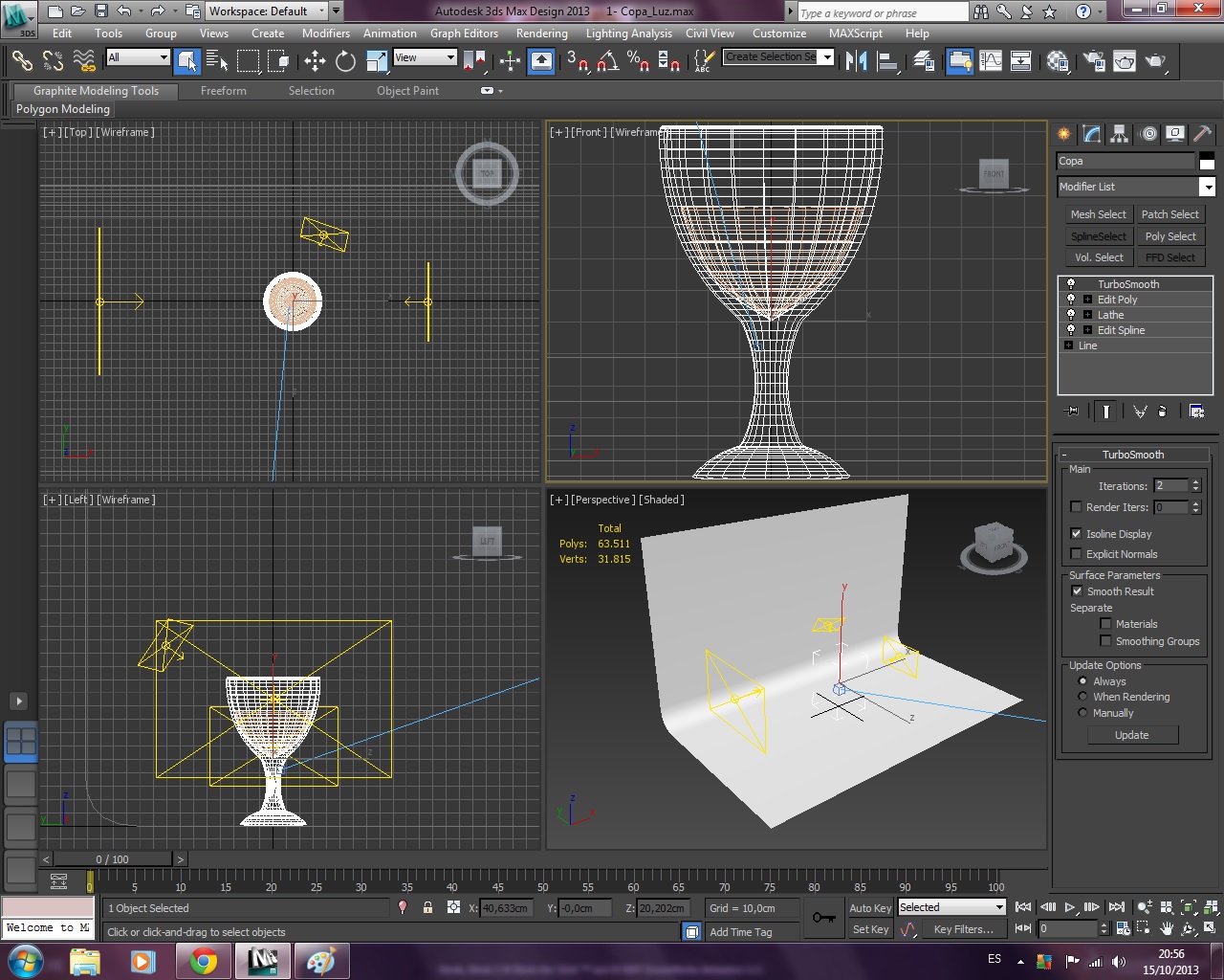 He de decir que la copa se ha creado a partir de 1 spline, luego le aplique un modificador edit spline, lathe, Edit Poly y por último el TurboSmooth.