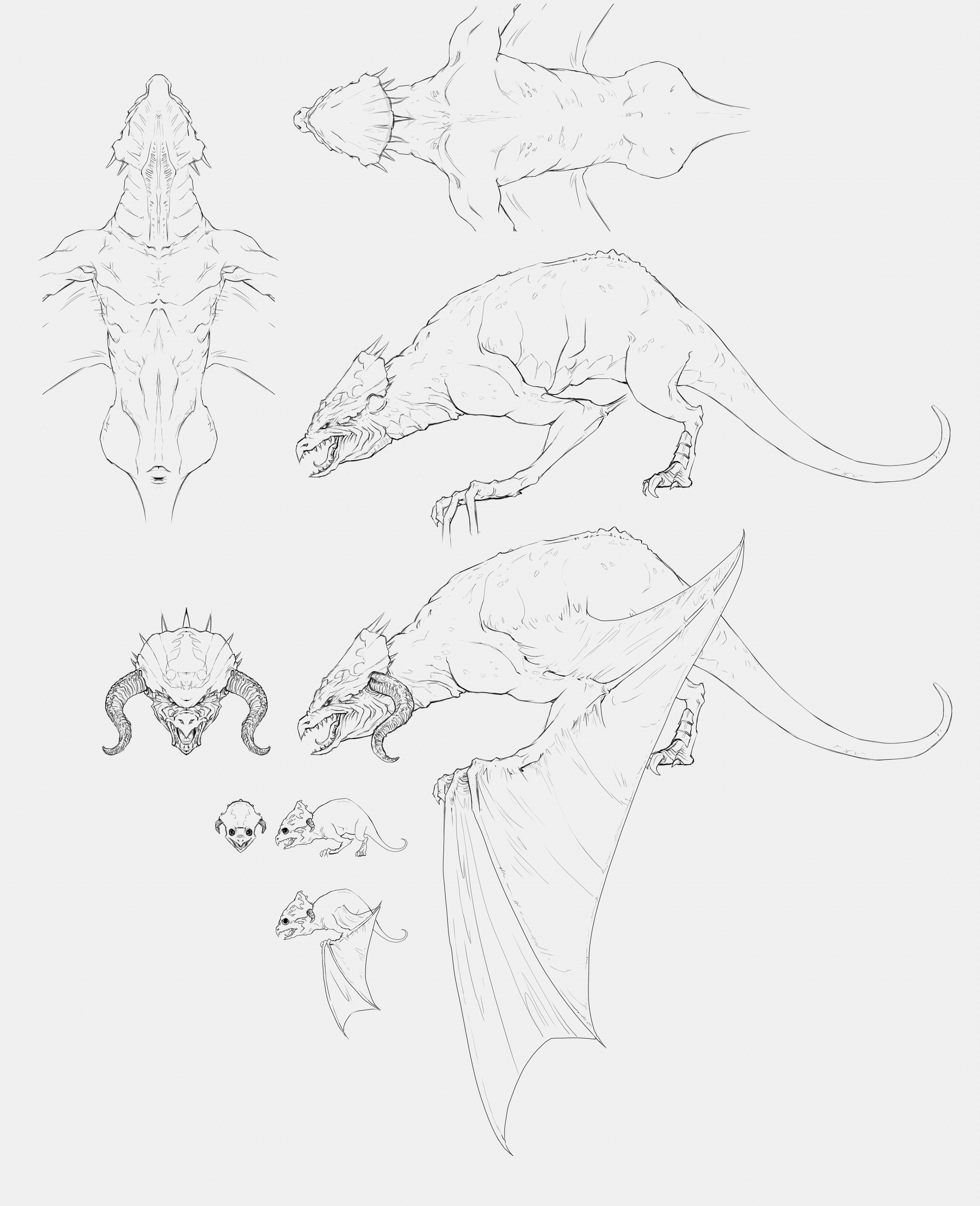 Siempre es más cómodo modelar completamente el dragón en una malla base y luego terminar los detalles en Mudbox, o si puedes, ir pasando el modelo entre ambos programas, para ir añadiendo o retocando partes a la vez. Dependiendo de para qué quieras el modelo, si para animar, o posarlo en alta resolución y hacer un render estático, quizá necesites una vez esculpas en Mudbox, hacer una retopología, que vendría a ser modelar nuevamente en baja, pero siguiendo los detalles del modelo en alta, para luego proyectar el resto de detalles por textura (normal map es más usado para tiempo real en juegos) o normal map y mapas de desplazamiento, para render en producción-animación y renders estaticos.