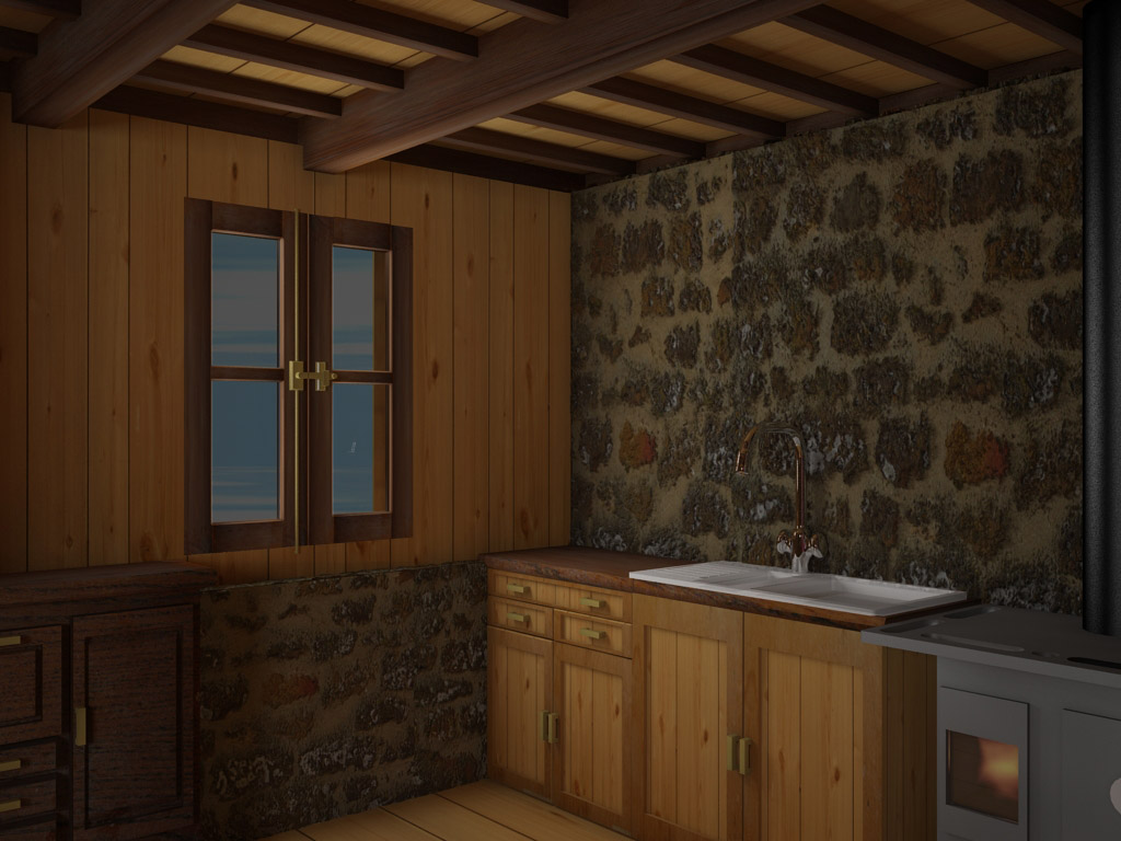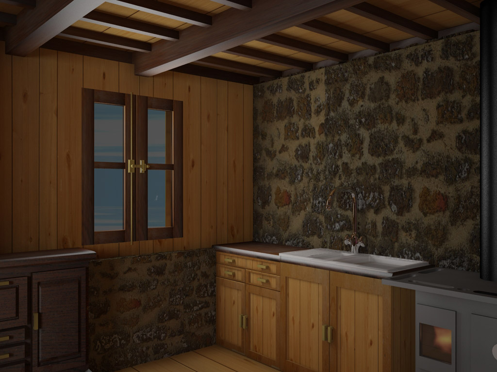 Con respecto a mejorar la imagen, como consejos te diría pruebes mejorar la iluminación de la escena, el especular de varios elementos me parece algo excesivo (por ejemplo, la mesada, las maderas del techo y el caño de la estufa) debería pasar un poco más desapercibido.