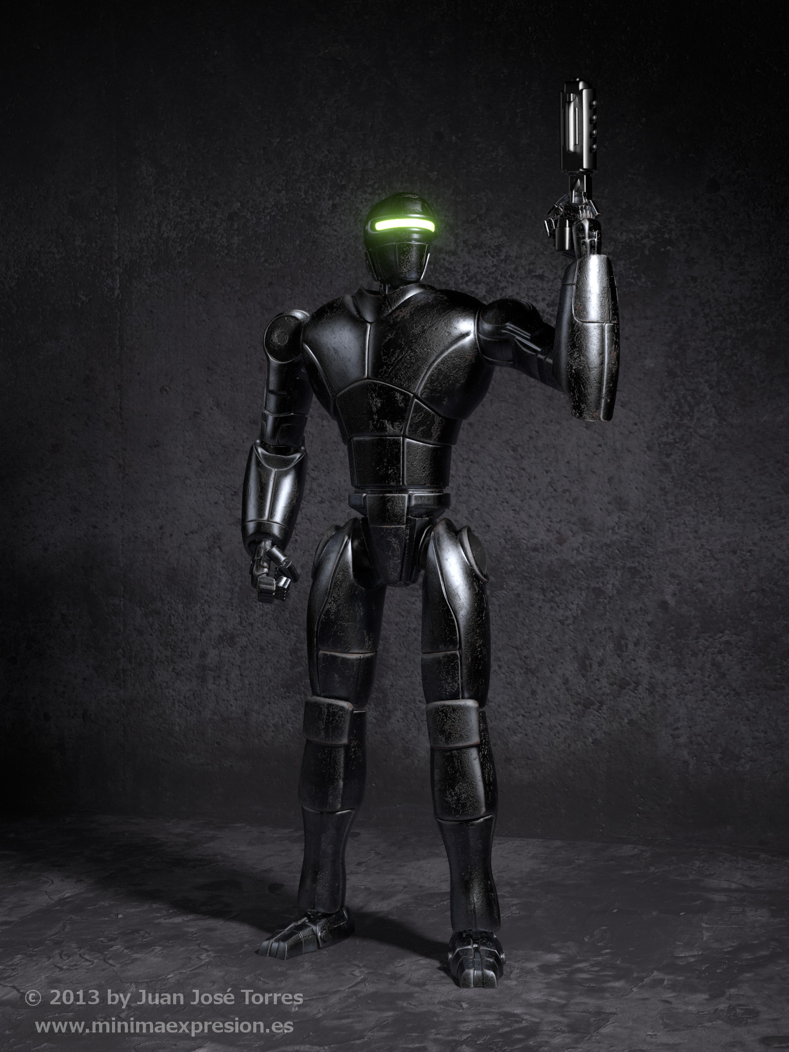 Vaya cambio con las texturas. Lo único que veo un poco raro es la forma de la espalda. A las personas nos hace la columna una especie de S, y en el robot que has hecho es recta y queda como raro. Aunque al ser un robot, tampoco tiene por qué ser antropomórfico, es una cuestión de gusto personal.