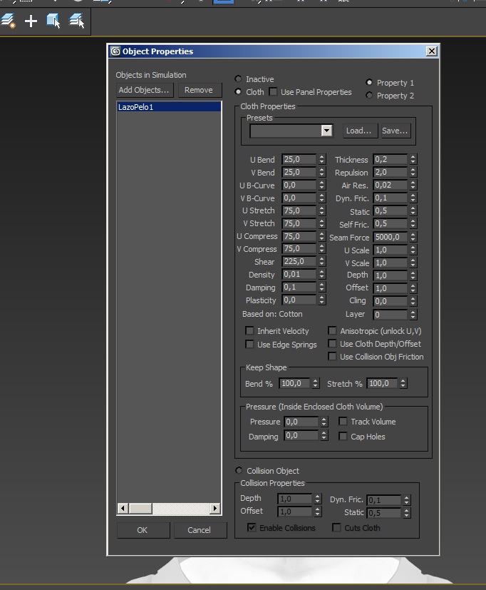 Pero a comenzar la simulación, no obtengo el comportamiento adecuando, ya qué busco algo más de dureza en la tela, quisiera saber que parámetros debo setear en el modificador para qué el lazo no se caiga al hacer la simulación, pero que si se mueva suavemente cuando la demás parte del cuerpo este corriendo la animación.