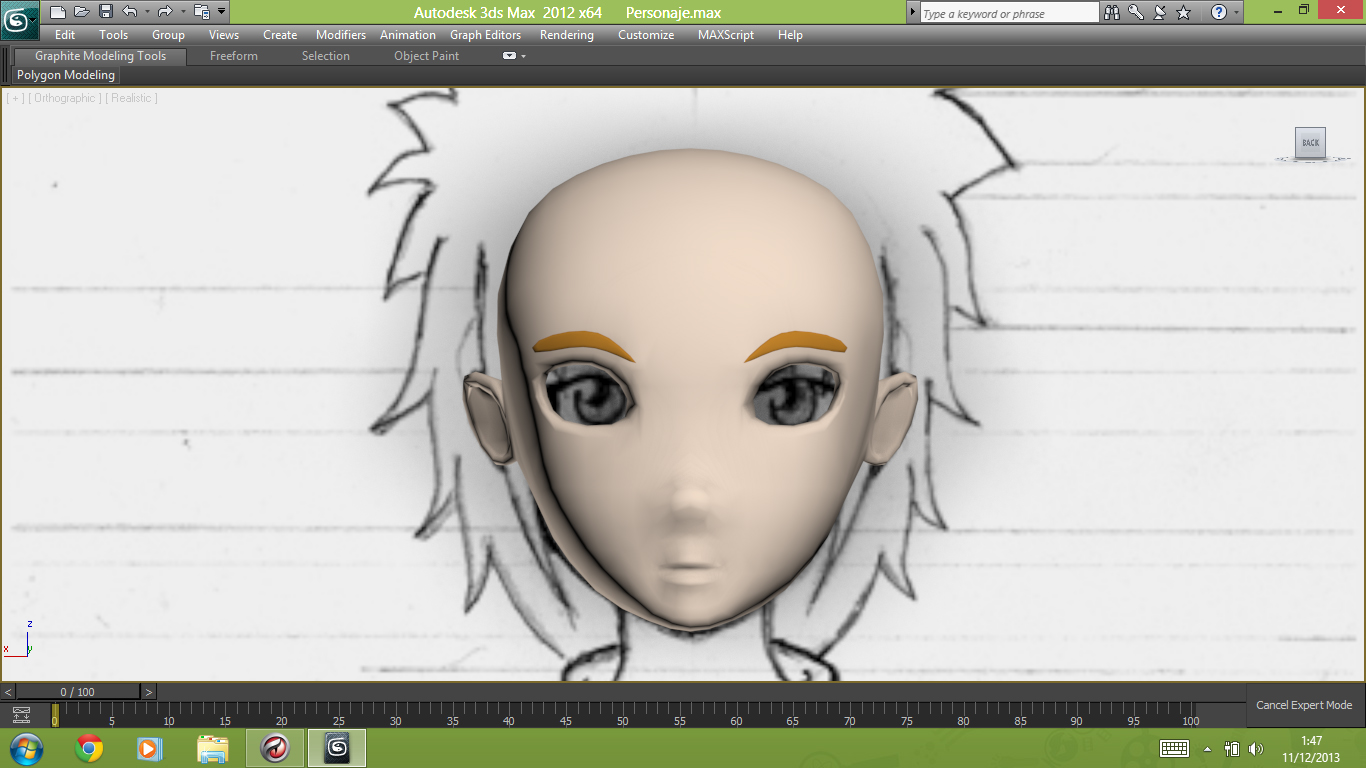 Bueno, después de estar un poco desconectado por causas de trabajo, y después de muchos intentos y modificando un poco el pelo del personaje, he logrado un tipo de pelo que me agrada. No tiene demasiados detalles en los mechones sino que son rectos para evitar crear más polígonos y además no aumentar la dificultad de modelar.