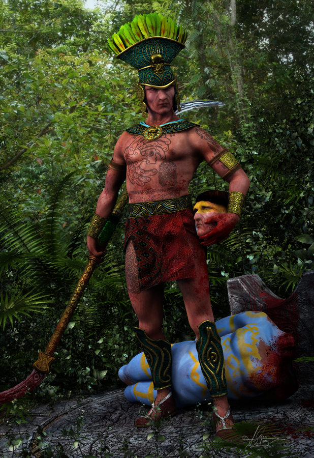 Hola a todos, esta imagen está inspirada en Apocalypto, aunque no representa ningún pasaje histórico y las armas y vestuario son inventados, si quise plasmar la crueldad de los sacrificios humanos que tanto peso tiene en la película.