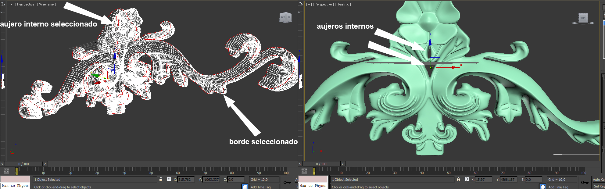 El procedimieto que sigo para alizar esto es que mi malla en la parte trasera esta descubierta entonces convirtiendo mi modelo a editable poli voy al nivel border y con el selecciono la orilla de la parte descubierta de mi malla qué es lo que muestro en la primera imagen que adjunto no sé si se alcance a distinguir la línea roja qué muestra lo que eh seleccionado, después únicamente pongo un Cap y se rellena, pero aún si selecciono también los bordes internos, igual me los rellena, no sé cómo hacer para dejar estos huecos que necesito, muestro el modelo por la parte frontal en donde se ven dónde están los huecos, bajo la flor y otro más que está un poco más abajo.