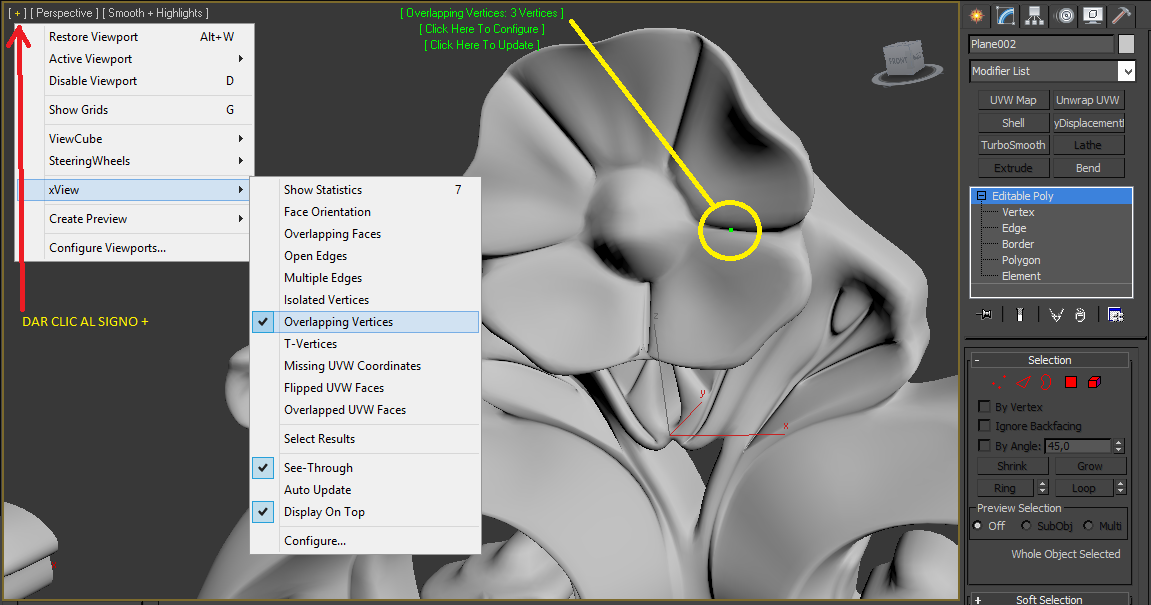 El Xview lo activas en 3dsmax, yo uso el 2012, pero no se desde que versión esta. Habían isolates vértices, overlapping vértices, unos pocos, te adjunto una captura de pantalla.