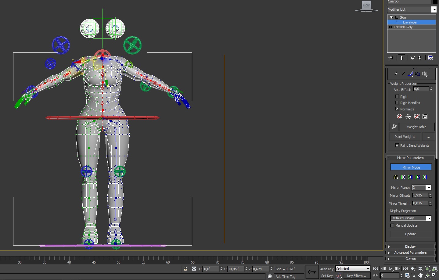 El problema viene en el peso de los vértices, hago el lado Izquierdo, todo bonico y pechocho y cuando le doy al mirror mode dentro del Skins, me quedo mirando en plan Eh, si el pivote está en el centro, todo colapsado. ¿dónde esta la separación de colores? me pongo a mover el Mirror Offset hasta a tomar por saquíto y pienso. bueno, esta alejado, pero mientras me funcione, error, se pasa el copiado y pegado por los jander.