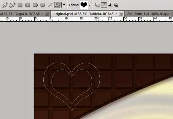 20. Nos dirigimos hasta la capa donde creamos la tableta de chocolate y sin seleccionarla hacemos Control+Click sobre su máscara de capa, seguido de Mayus+Control+I lo cual nos seleccionara la figura del corazón.
