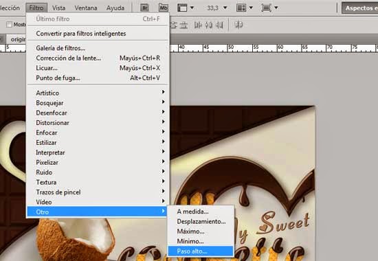 32. Duplicar la capa obtenida e ir a Filtro/Otro/Paso alto y darle un valor de 10 pixeles.