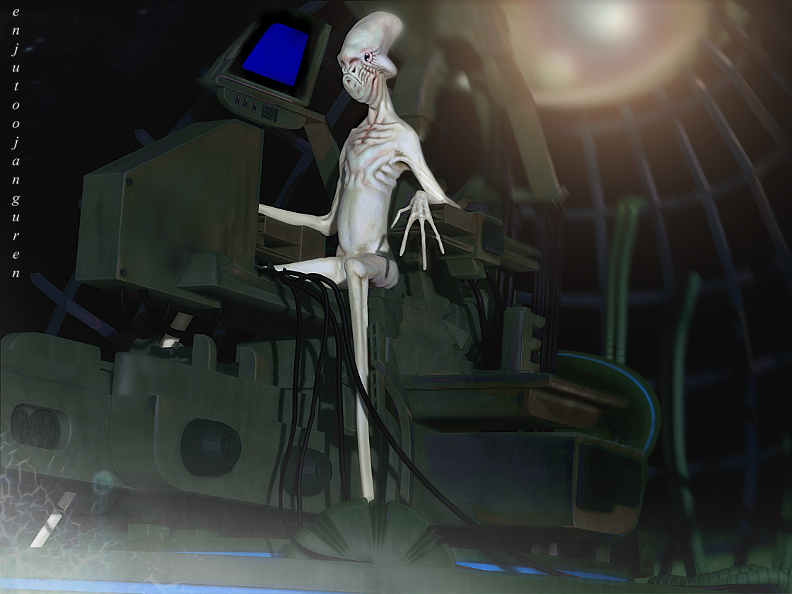 Muy bueno, me gusta el ambiente que le has dado. Hecho un poco en falta algo de brillo o reflexión en algunos materiales, se ve todo muy mate, pero eso es algo personal. Por cierto, el marcianejo ese suele ir en pelota picada. Saludos.