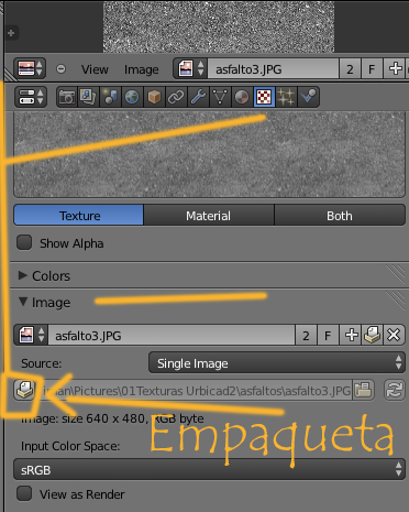 Para empaquetar la textura dentro del blend, solo tienes que pinchar sobre la caja qué hay junto al nombre de la imagen.