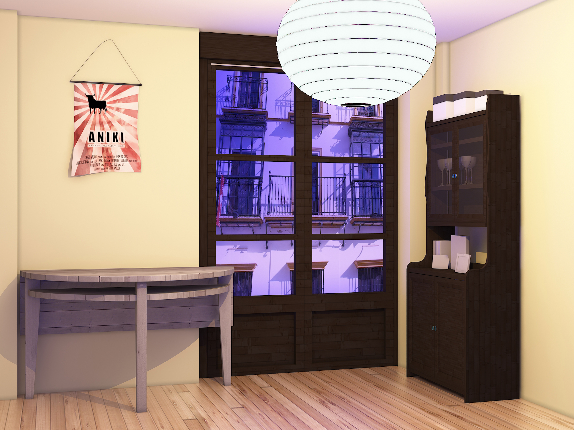 Hola, hice unas pruebas para que veas como debería ir la perspectiva de la fotografía de fondo, espero no este del todo mal, trate de imaginar las dimensiones de los objetos en escena.