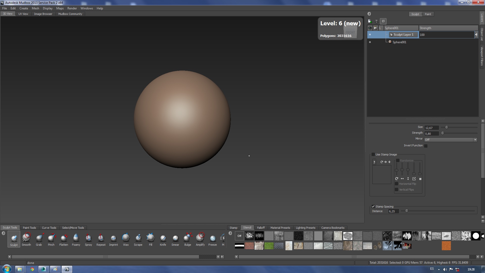 Una vez hagas eso, tendrás tu esfera con 2 valores de subdivisión en Mudbox, y ya desde ahí, puedes añadir más niveles y esculpir a tu modo.