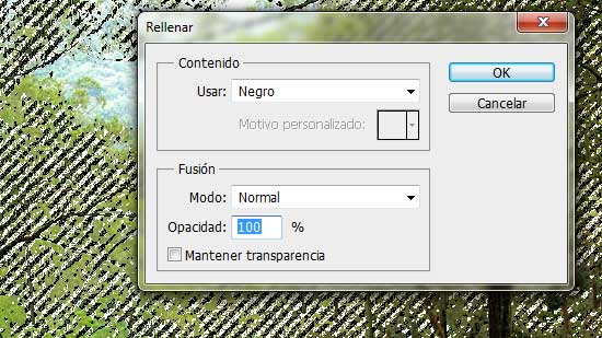 Ve ahora hasta Edición/Rellenar y en la sección de Contenido/Usar selecciona el color Negro, clic a continuación en Ok y seguidamente Control+D para deseleccionar.
