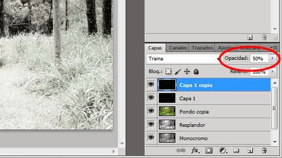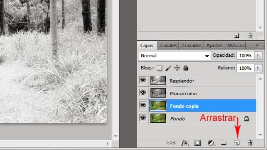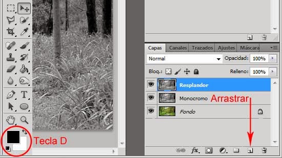 Duplica la capa Monocromo. La renombras como Resplandor. Pulsa la tecla D para colocar los colores frontal y fondo por defecto (negro y blanco) en la paleta de colores.