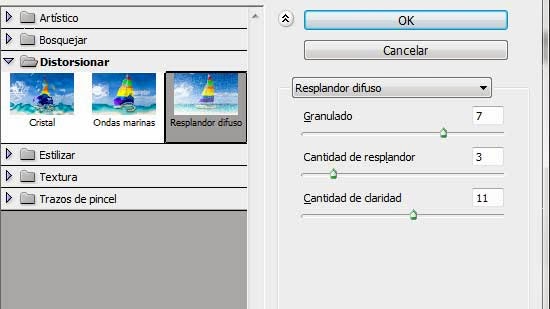 A continuación dirígete hasta el menú Filtro/Distorsionar/Resplandor Difuso y aplica los siguientes valores: