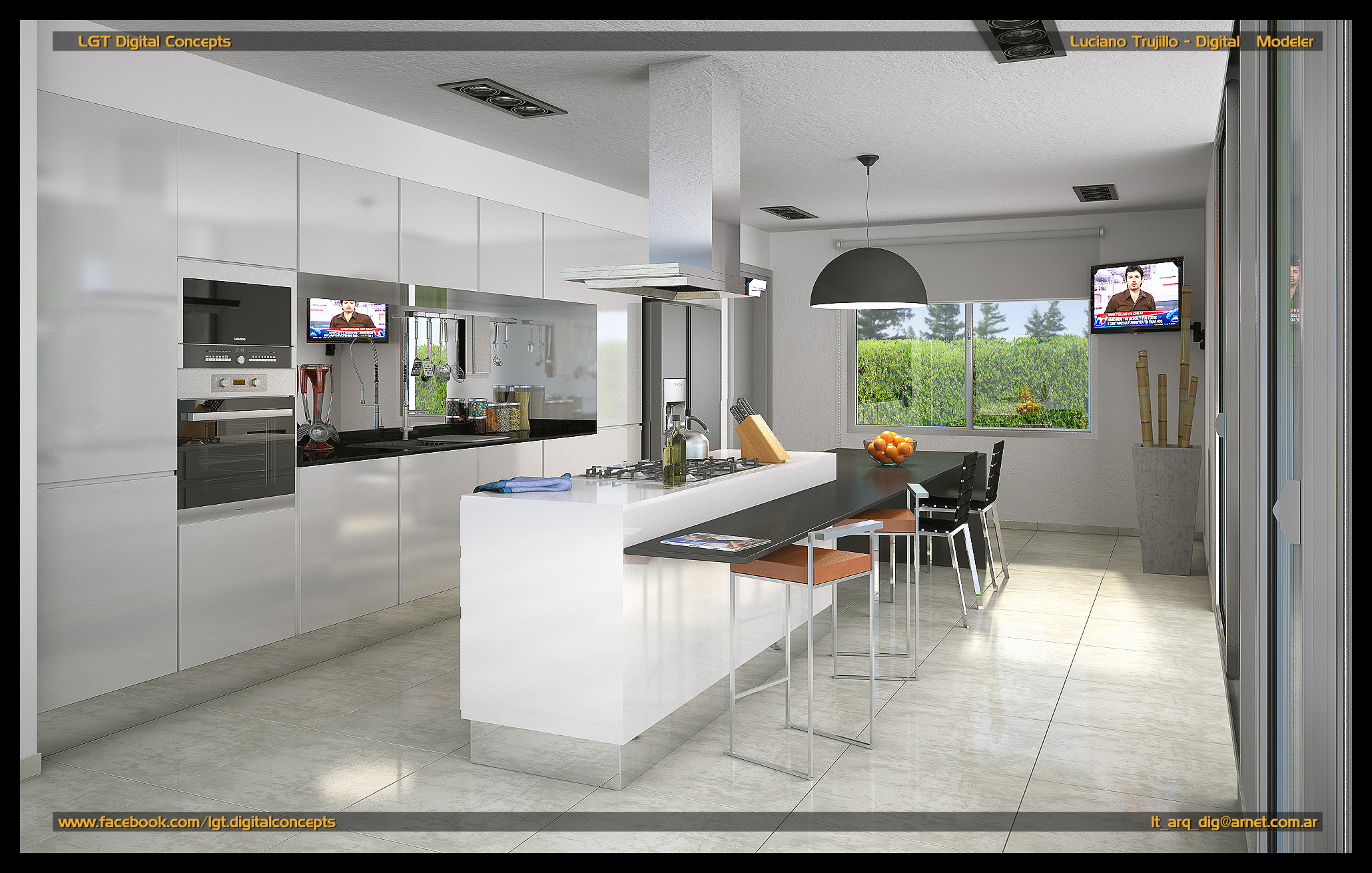 Tiene buena pinta, aunque algunas cosas como las que te coment el compañero se podrían corregir. Además, creo que el exterior debería estar más sobrexpuesto. Las puertas de los armarios no tienen tirador, supongo que, serán de presión, pero debería algo diferenciar por que lado presionar. El cubre paño parece un espejo, lo veo algo raro. Los dos taburetes más cercanos a cámara son muy altos, si te sientas ahí no te podrás acercar a la barrapor que no caben las piernas/muslos. Los bambos los veo muy forzados ahí, demasiado grandes y el macetero muy bruto también y el bump del techo me parece exagerado. Saludos.