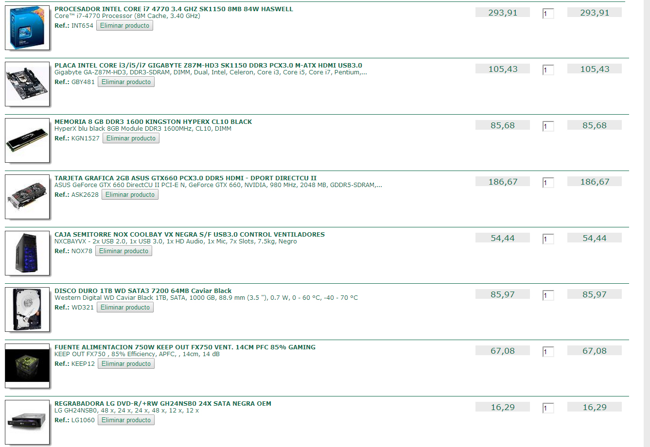 Bueno, pues ya está ya he dado 200 euros de señal en pcbox, lo tendré el miércoles por la noche, si todo va bien, en total 1050 euros, cada vez que lo digo duele más, con las siguientes componentes: Los precios como lo he comprado en tienda, me han salido más baratos cada componente.