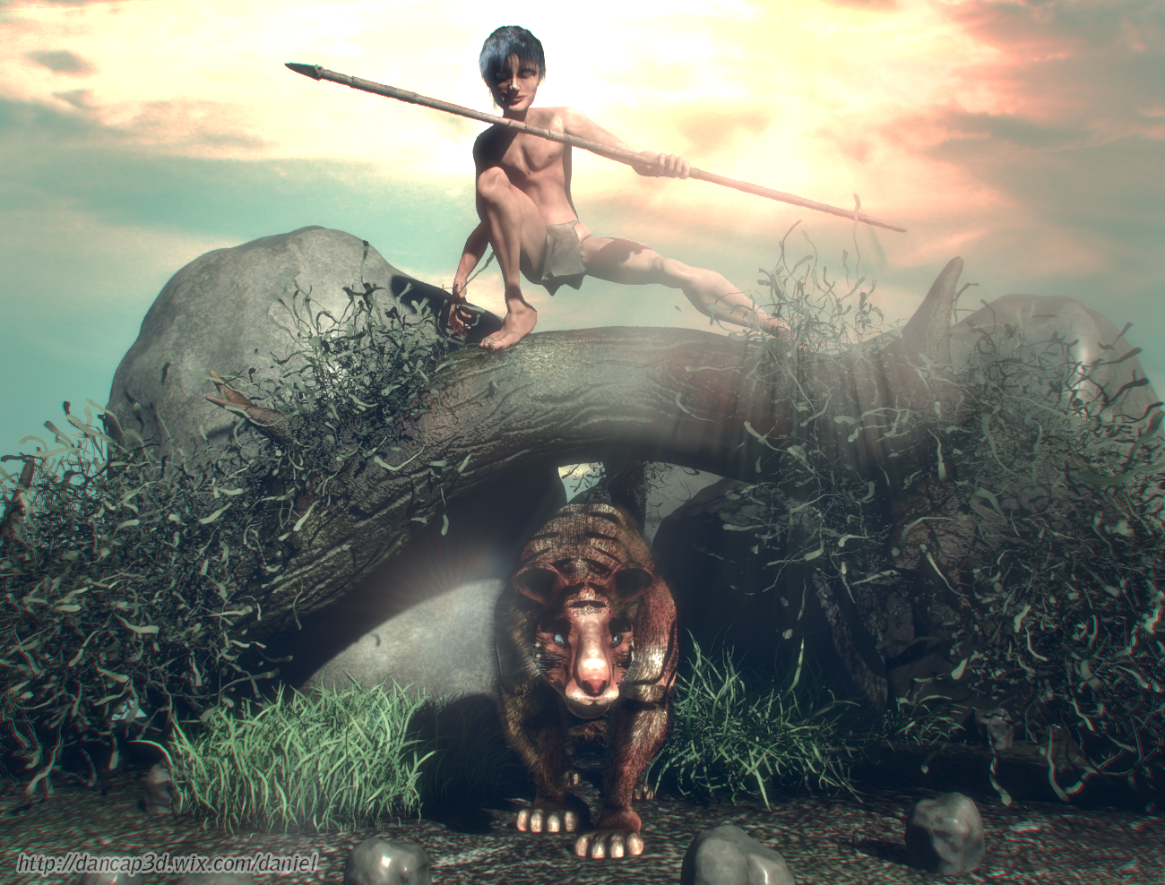 Te has pasado con la aberración cromatica, así como 3 o 4 pueblos (casi hay que ponerse unas gafas de 3d para poder verlo). El pie derecho del personaje está bastante raro. El tigre muy plano, un poco pelón, ¿no? Si le metes otro cielo que tenga mejor resolución, ganaría la composición. El suelo demasiado plano. Es lo que más me canta así a priori. Un saludo.