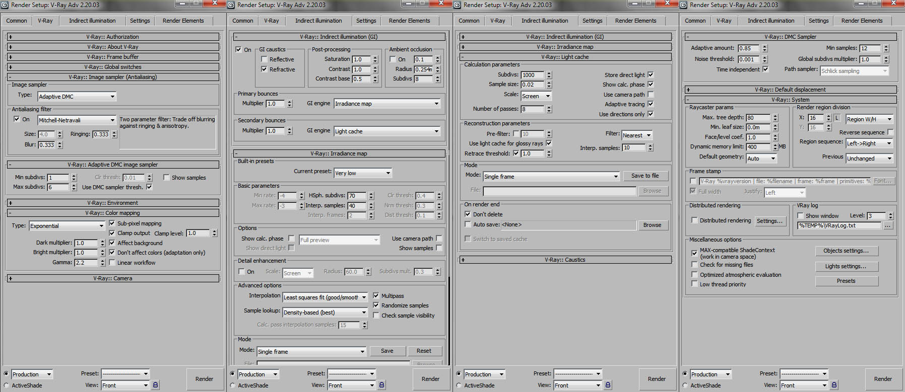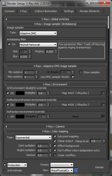 No tenía ningún exposure control. Probé poniendo el de Vray, pero como no cambió nada volví a quitarselo.