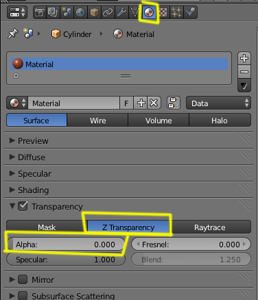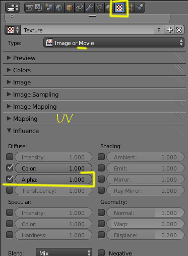 Luego en el material activas la opción Transparency y pones un valor de cero. Y en Texture, activas en Influence, el ALPHA a uno.