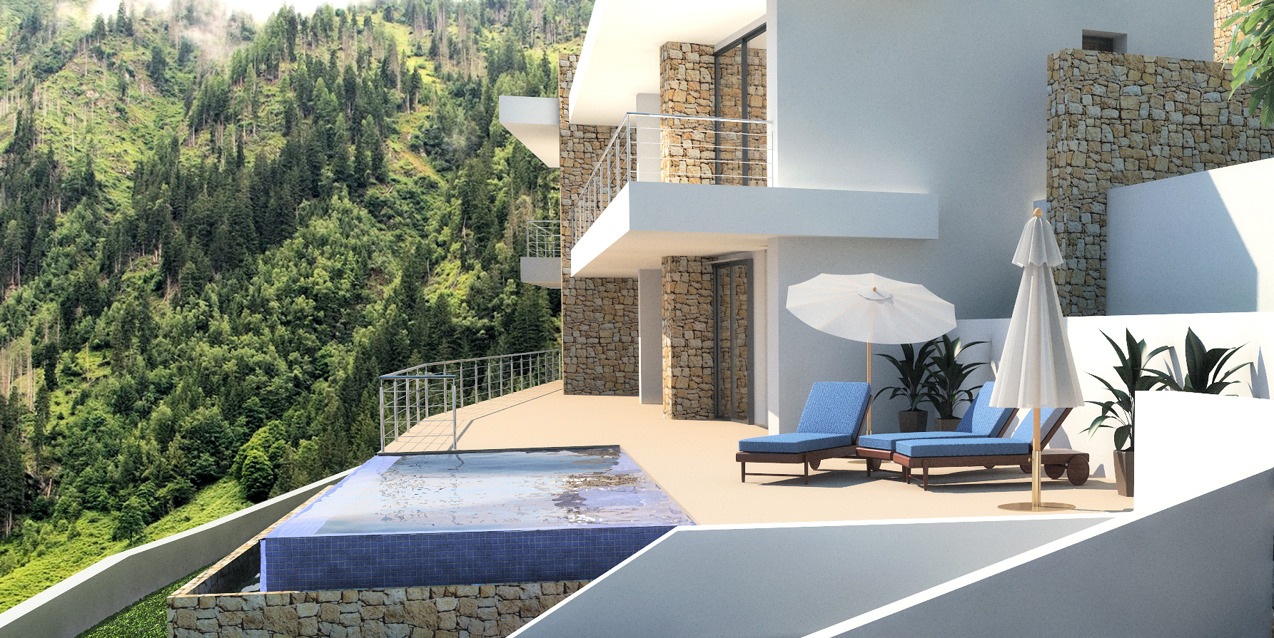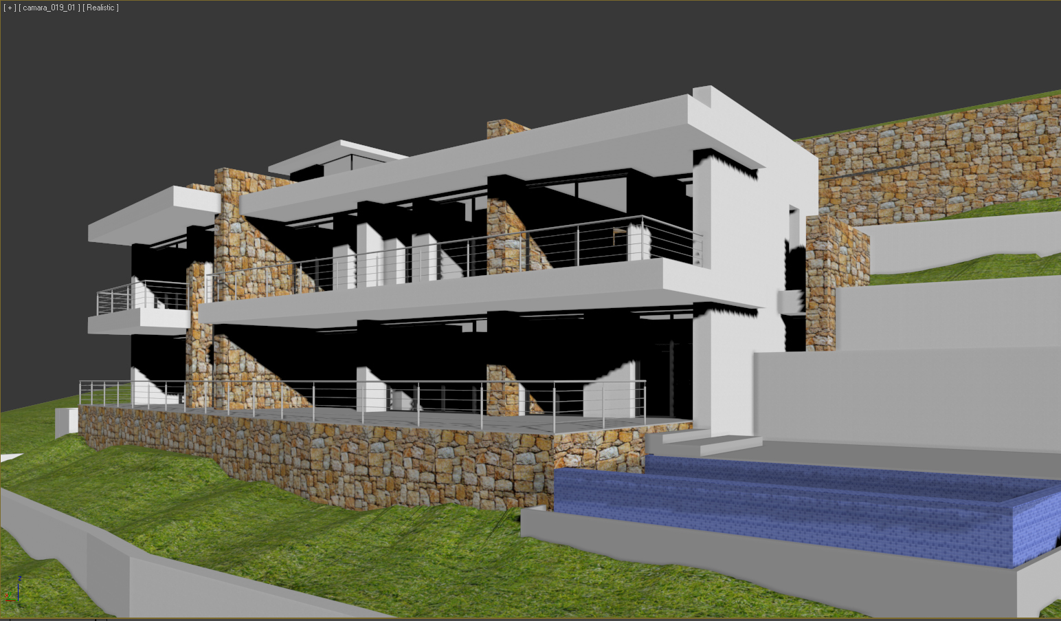 Hola, a mejorado mucho, con todo colocado, la textura de piedra mucho mejor, se puede mejorar aún más, pero creo que es suficiente para qué continúes con otras cosas, mejorar algún material, sobre todo la reflexión de los vidrios, es un detalle que llama mucho la atención y aporta credibilidad al modelo, luego la iluminación, es un poco plana, le falta contraste, a mi gusto claro.