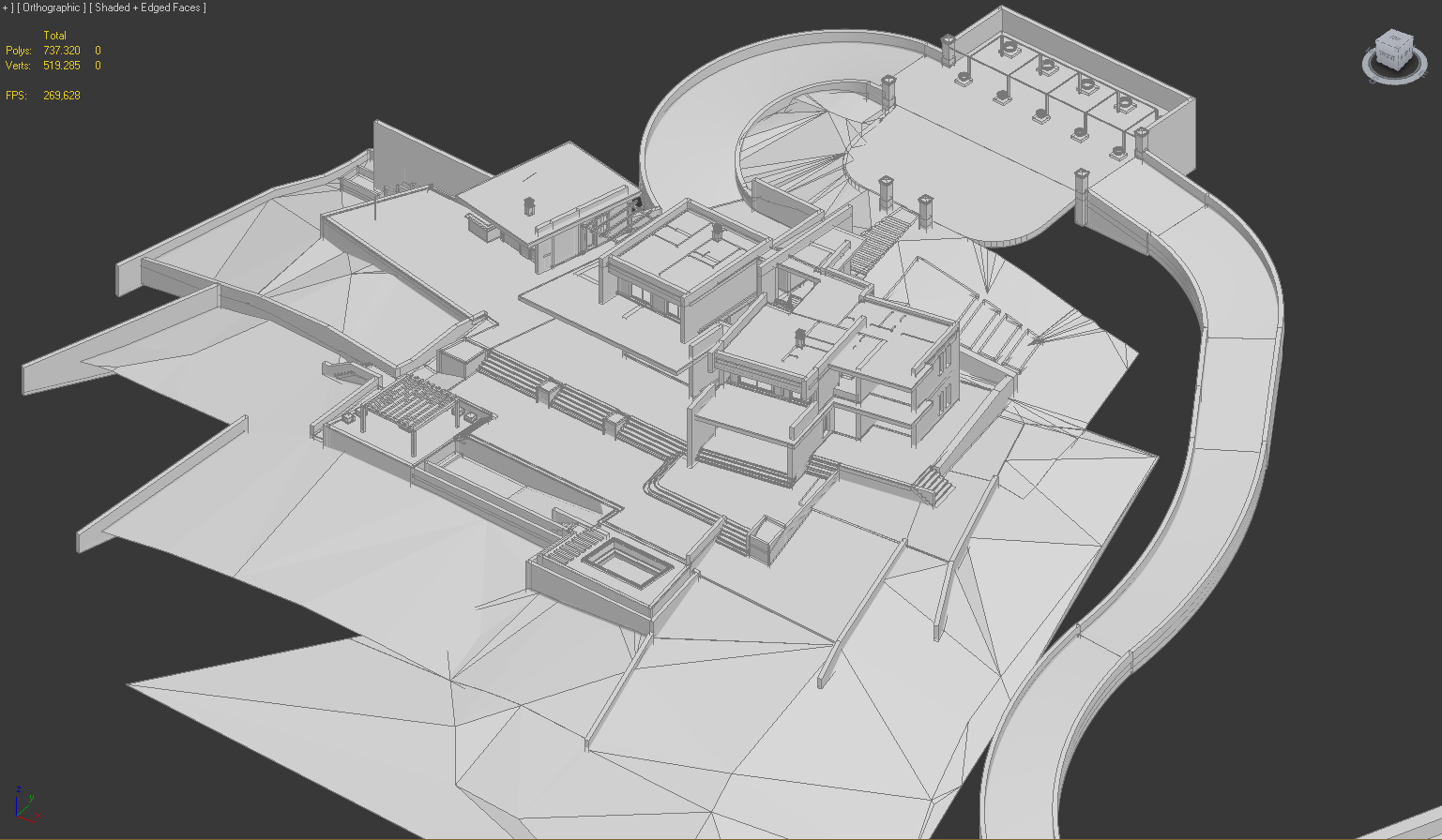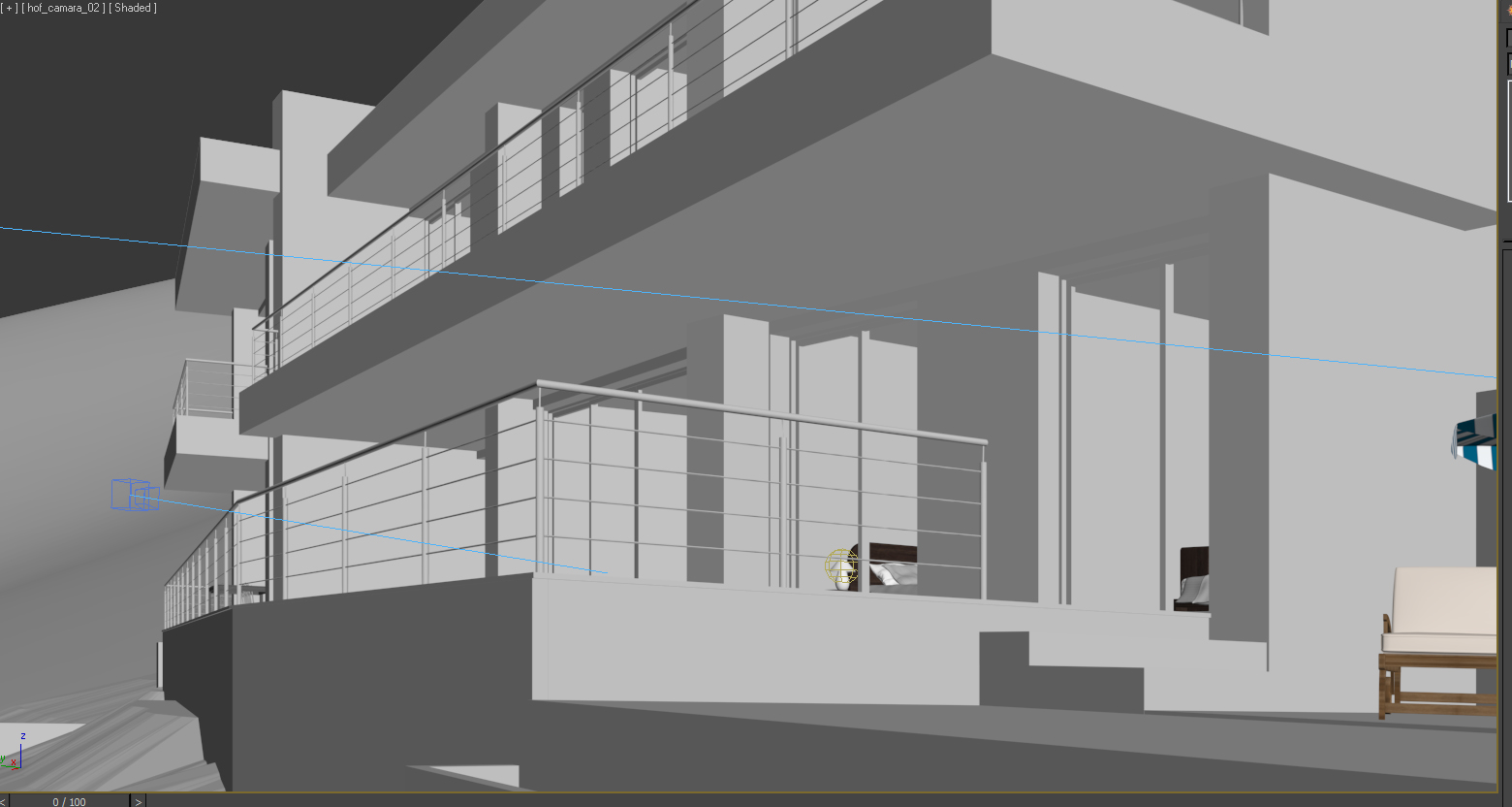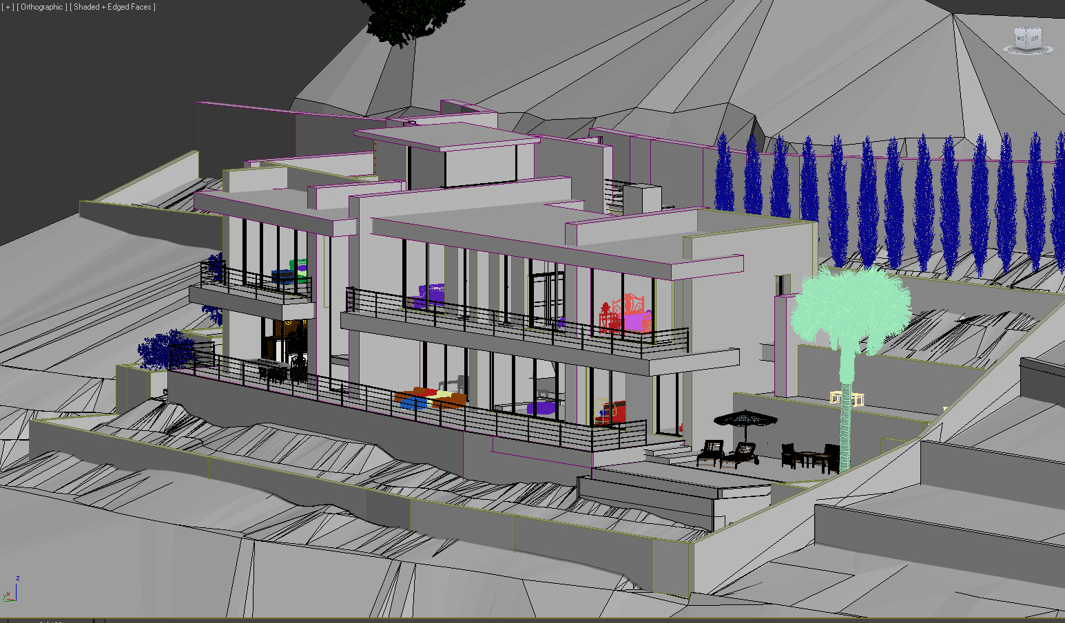 La iluminación y los materiales (shaders) son otro asunto aparte, que depende del grado de realismo que quieras lograr y el motor que quieras usar, Mental Ray, Vray, Maxwell, Por ahora me concentraría en terminar toda la parte de modelado al nivel de detalle que quieras lograr en tu escena, incluyendo objetos como mobiliario, lámparas y vegetación. Y luego nos centraríamos en la iluminación, materiales y render. No te recomiendo, pasar a una sin terminar del todo otra. Un saludo.
